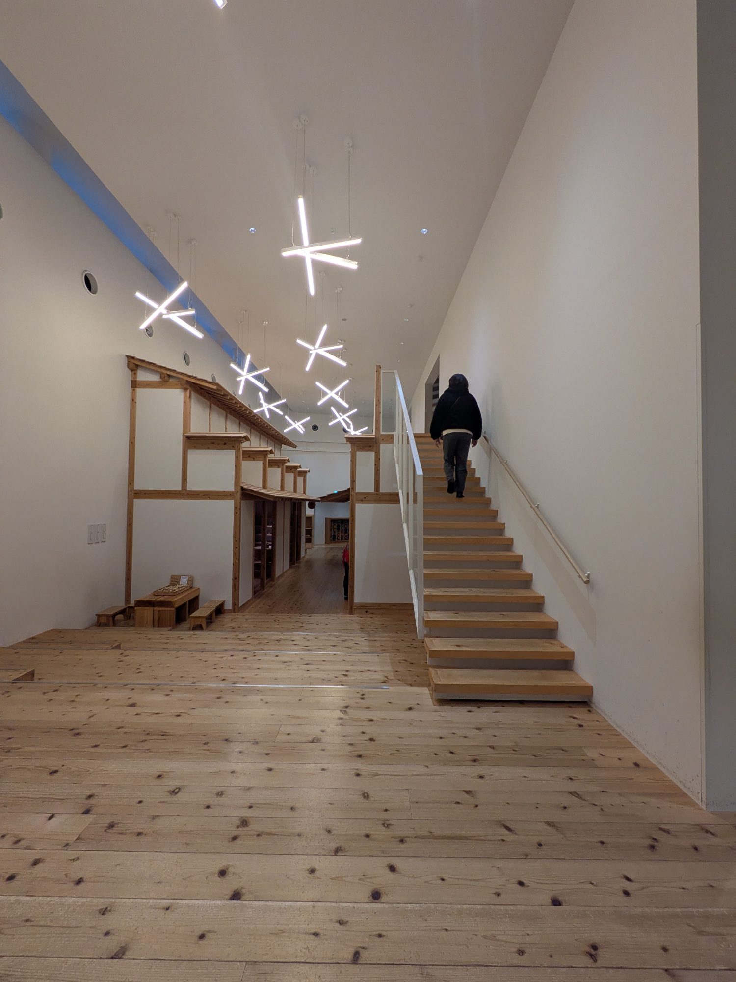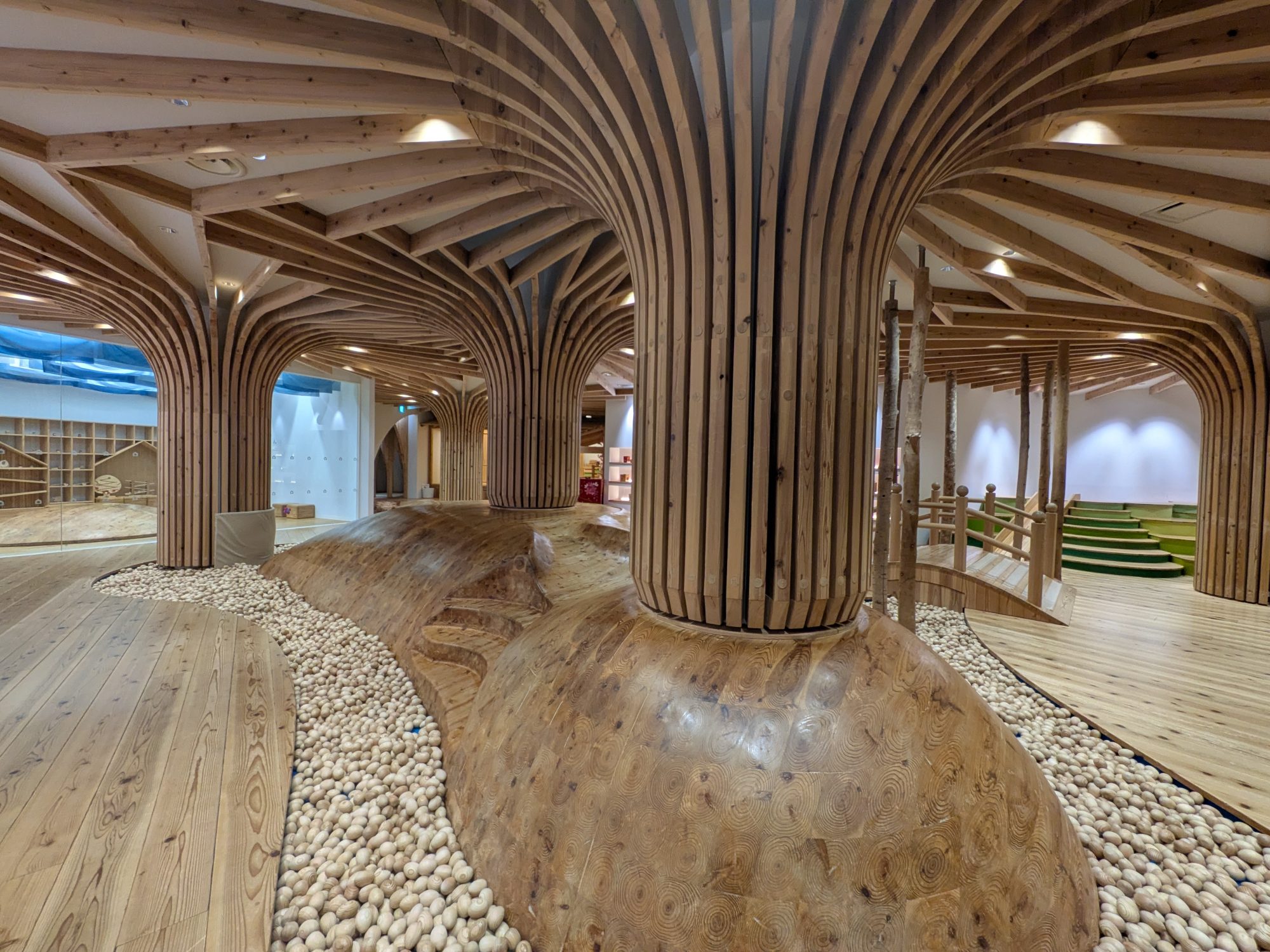 特筆すべきは、小さなお子様への徹底した配慮です。空間の角は丸みを帯び、床は素足で歩きたくなるような柔らかな質感。単なる「展示施設」ではなく、建物全体が大きな一つの「おもちゃ」であり、子供たちが無意識に木に触れ、その温かさを肌で感じられる設計になっています。