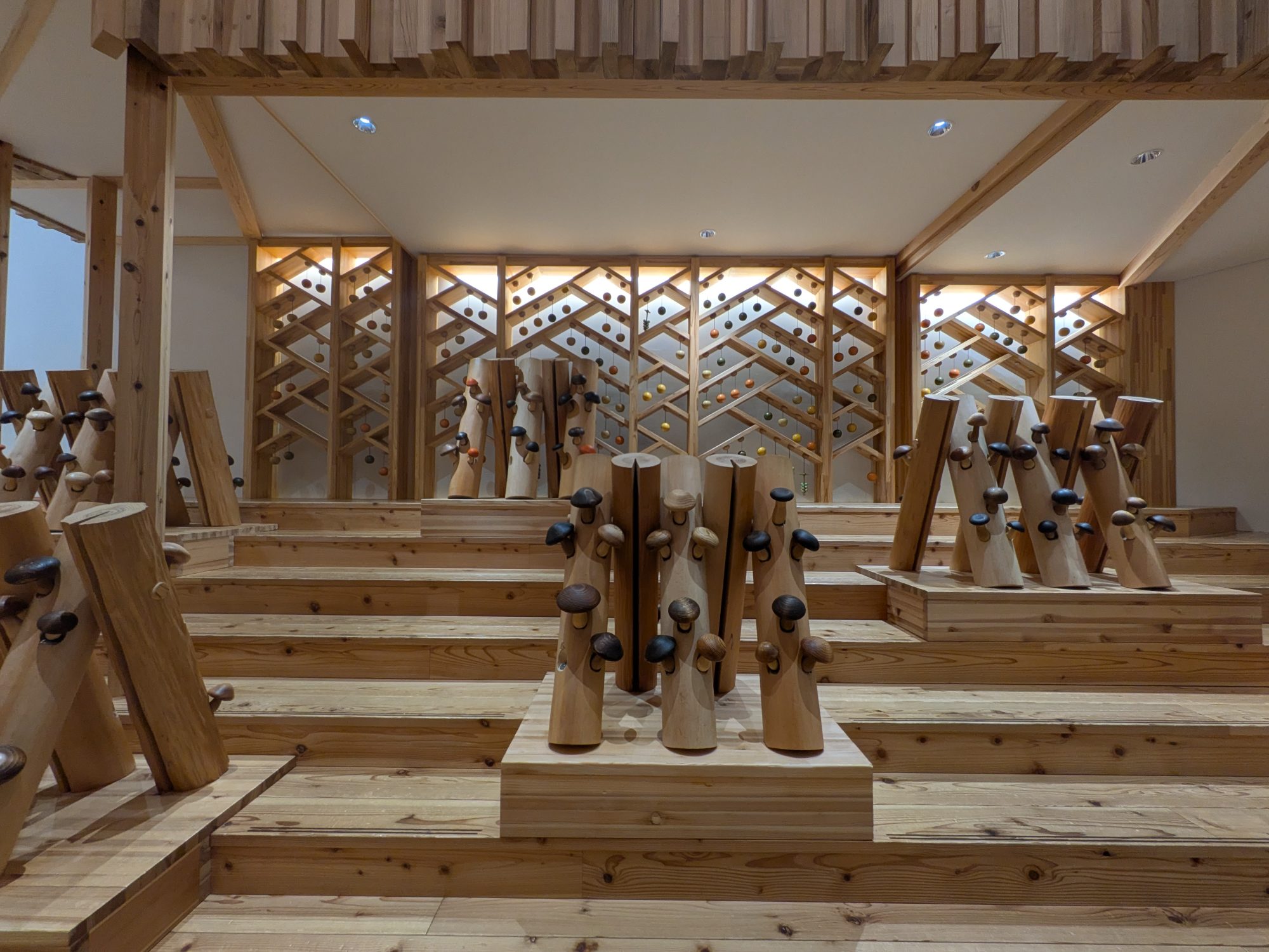一歩足を踏み入れると、そこには芳醇な杉の香りが広がっていました。この美術館は、徳島県産の杉を贅沢に使用しており、天井を見上げれば幾何学的な木組みの美しさに目を奪われます。