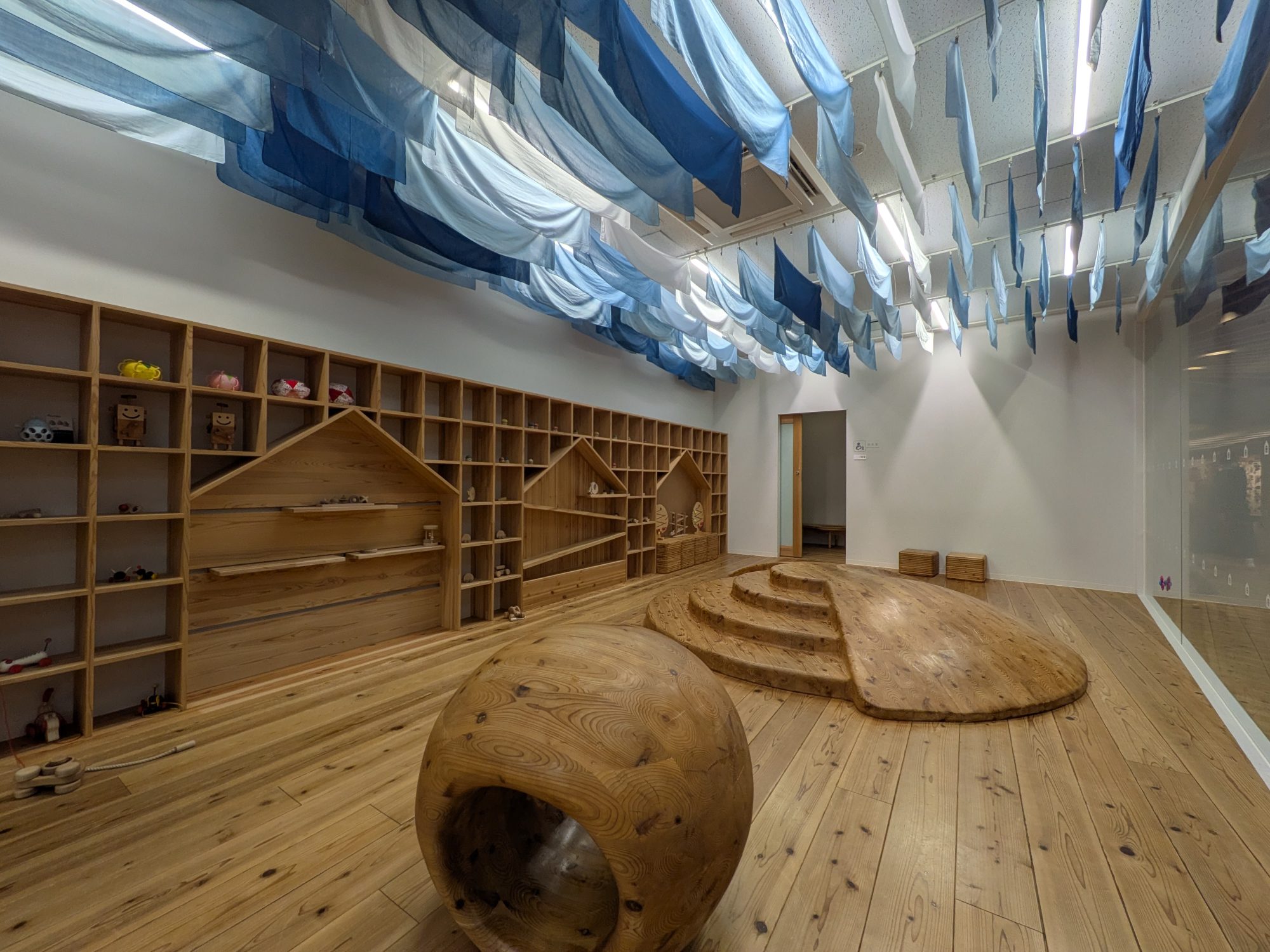 丸い遊具と藍染の美しい空間 |